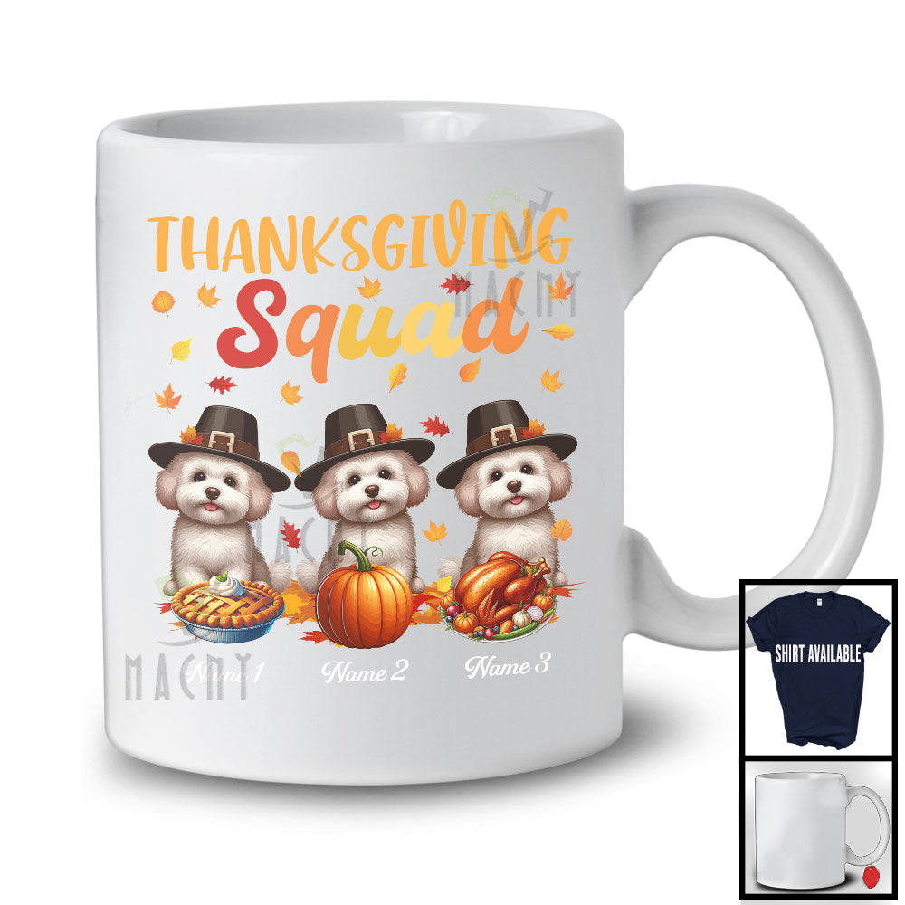 Personalized Thanksgiving Squad, Lovely Three Pilgrim Maltipoos, Custom Name Fall Leaves T-Shirt