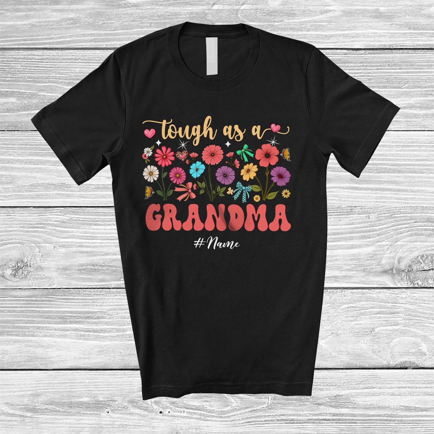 Personalized Tough As A Grandma; Floral Mother's Day Flowers; Custom Name Grandma Family T-Shirt. This cotton t-shirt is a durable staple product with a classic fit. One of the most popular items, it has a relaxed style made for everyday and casual wear.