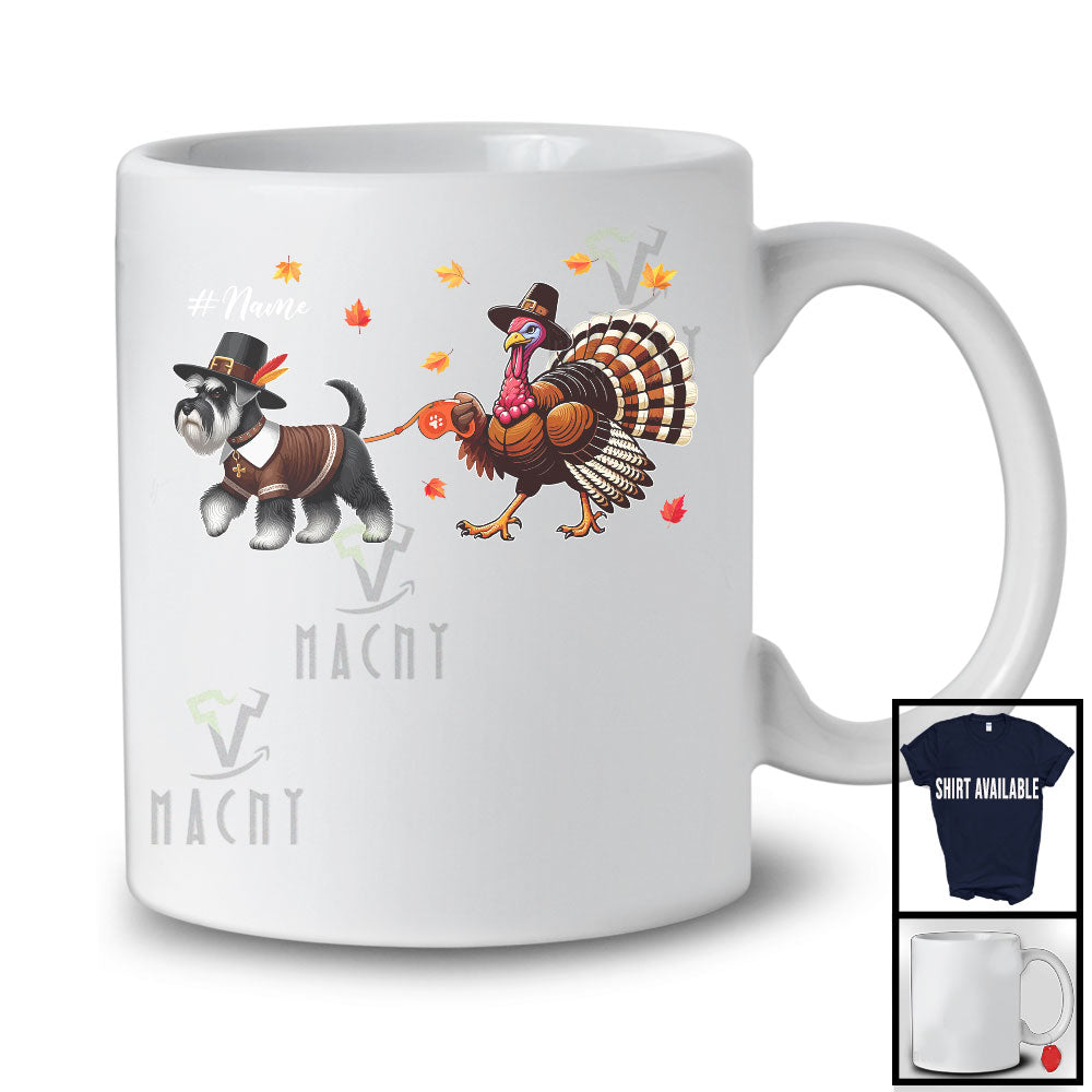 • Personalized Turkey Walking With Schnauzer; Happy Thanksgiving Custom Name Family T-Shirt. This cotton t-shirt is a durable staple product with a classic fit. One of the most popular items, it has a relaxed style made for everyday and casual wear.