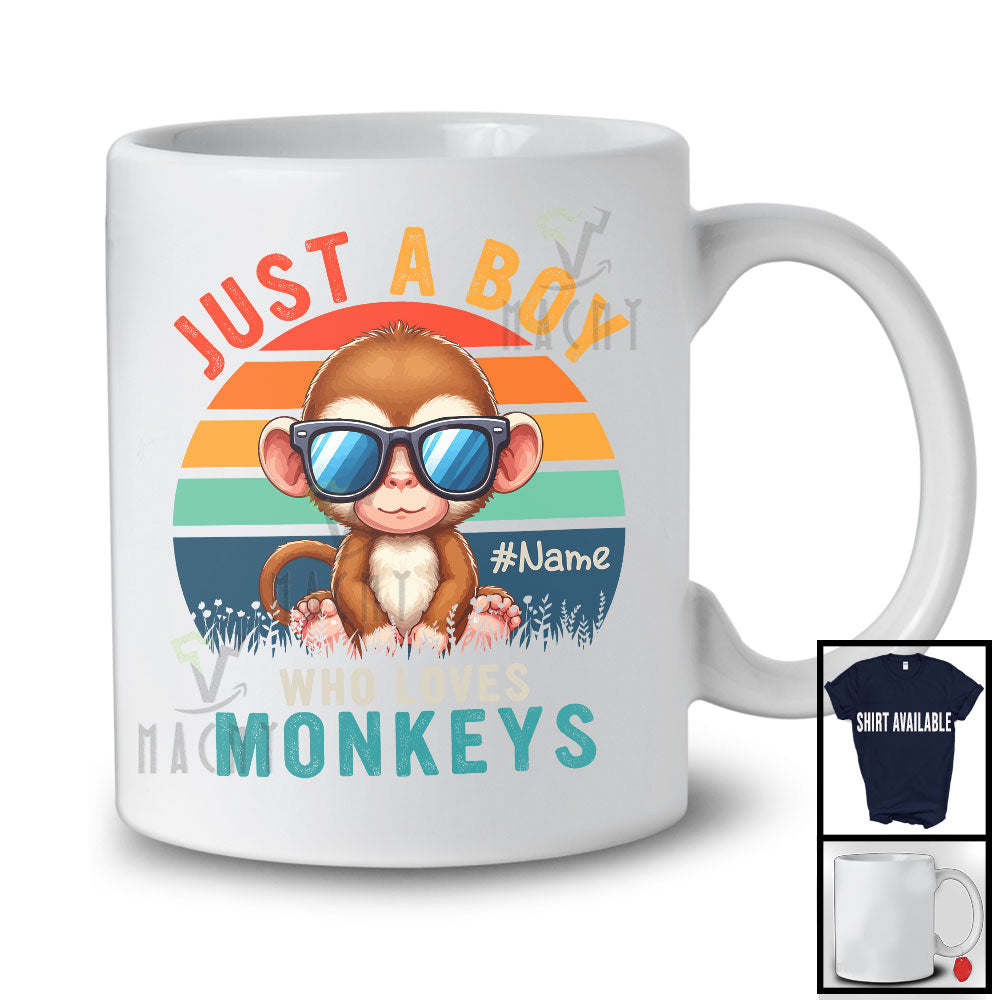 Personalized Vintage Retro Boy Who Loves Monkeys; Lovely Custom Name Animal Sunglasses T-Shirt. This cotton t-shirt is a durable staple product with a classic fit. One of the most popular items, it has a relaxed style made for everyday and casual wear.