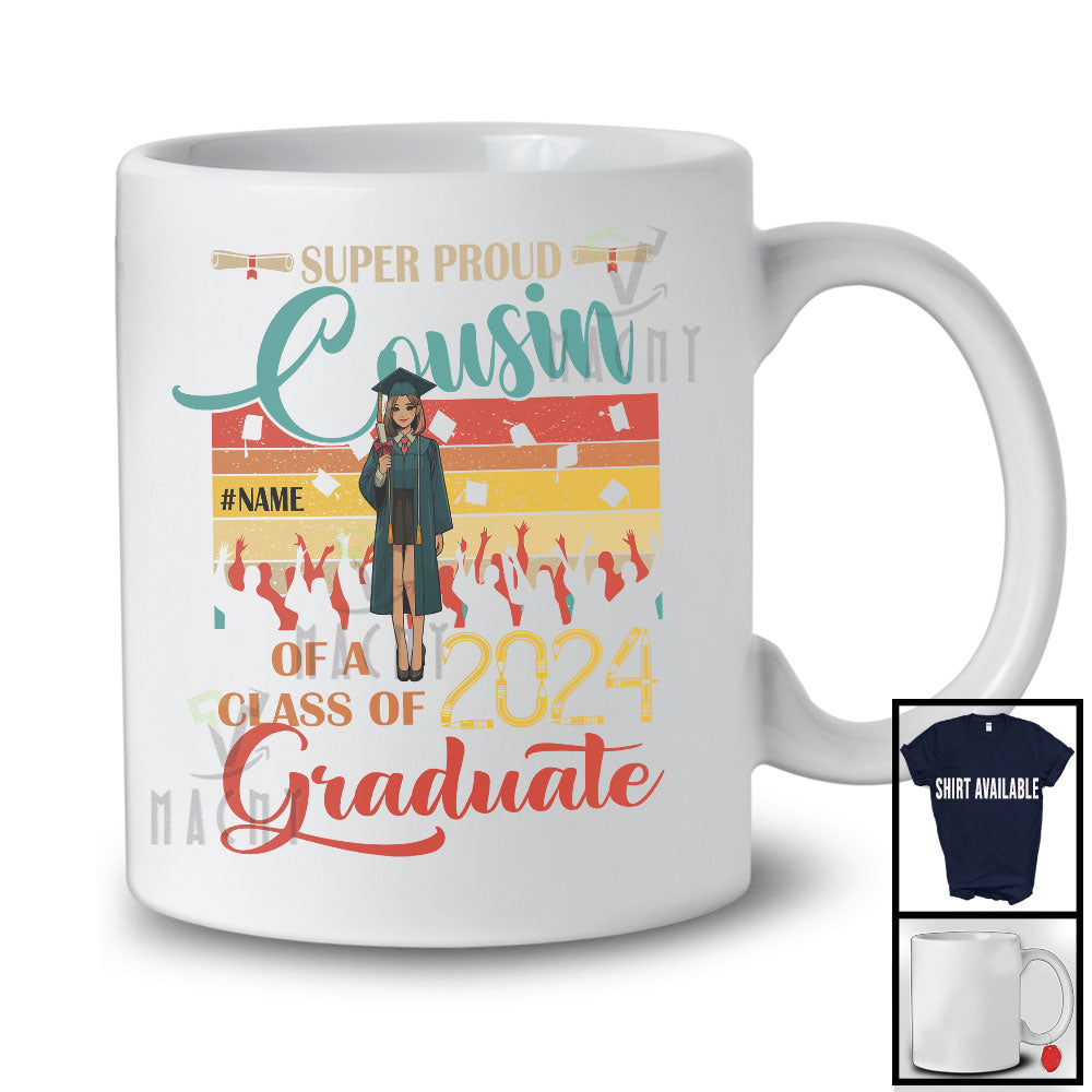 Every product is unique, just like you. If you're looking for a product that fits the mold of your life, the Personalized Vintage Retro Cousin Class Of 2024 Graduate, Super Proud Graduation Custom Name Girl Family T-Shirt is for you.