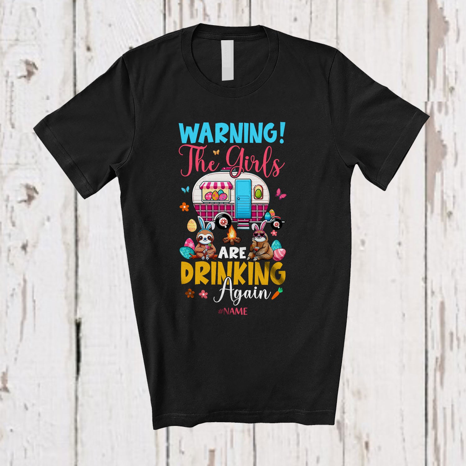 • Personalized Warning The Girls Are Drinking Again; Lovely Easter Custom Name Sloth Camping T-Shirt. This cotton t-shirt is a durable staple product with a classic fit. One of the most popular items, it has a relaxed style made for everyday and casual wear.