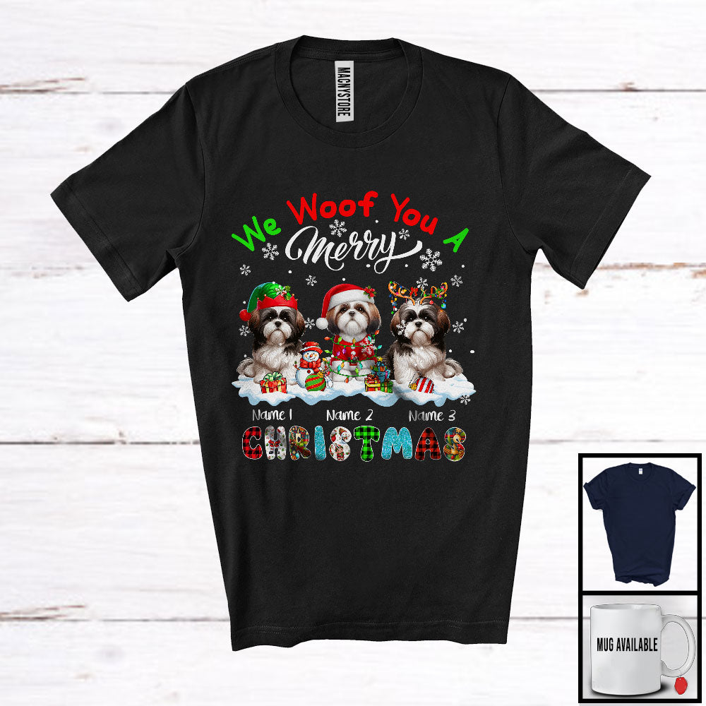 Personalized We Woof You A Merry Christmas; Lovely Plaid Shih Tzus Custom Name T-Shirt