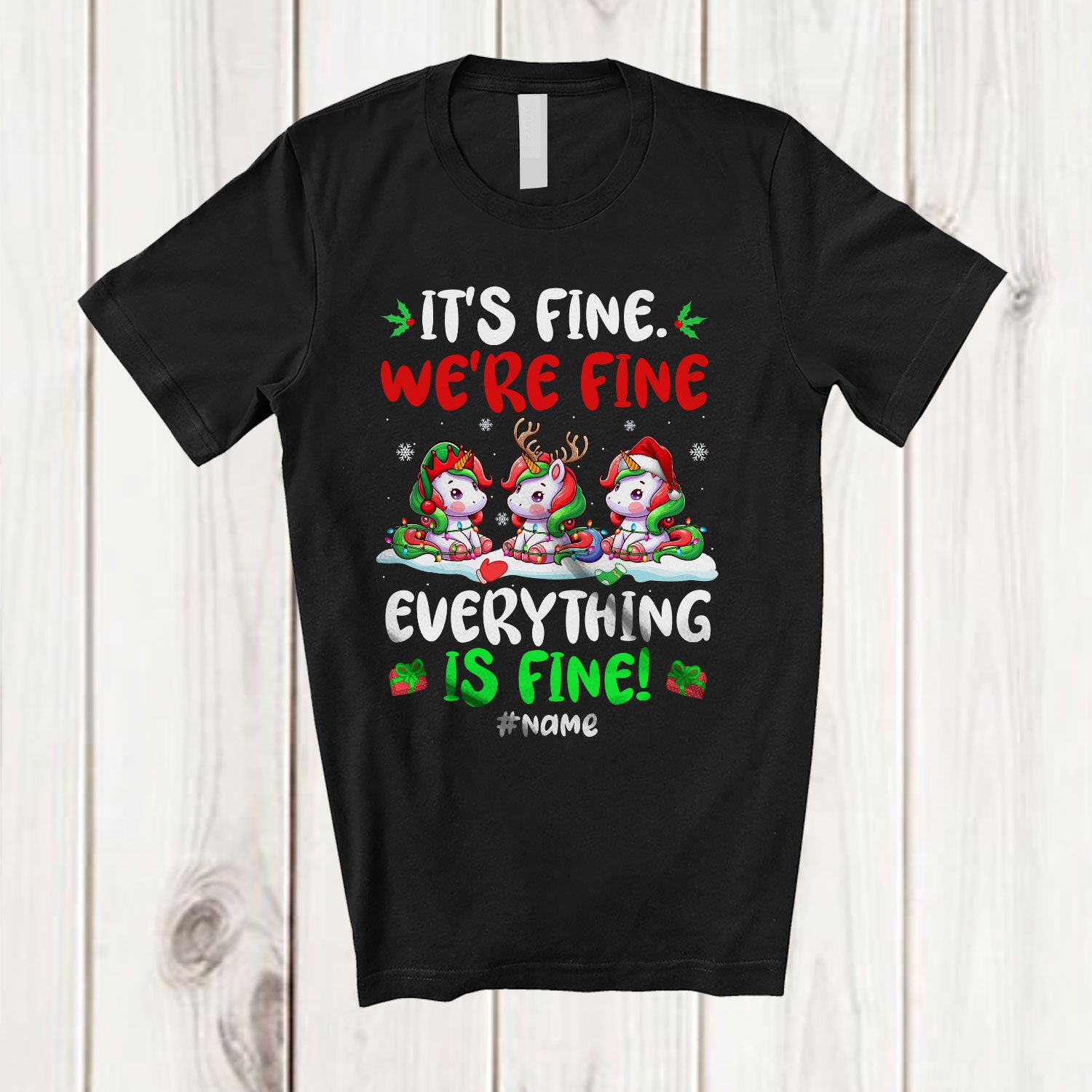 Personalized We're Fine Everything; Lovely Christmas Three Unicorn; Custom Name Teacher T-Shirt