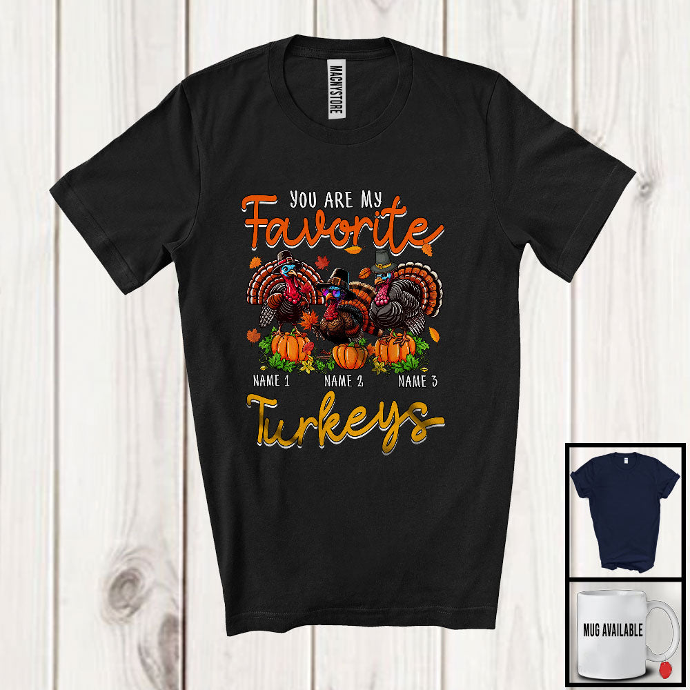 Personalized You Are My Favorite Turkeys; Adorable Thanksgiving Custom Name Three Turkeys T-Shirt. This cotton t-shirt is a durable staple product with a classic fit. One of the most popular items, it has a relaxed style made for everyday and casual wear.