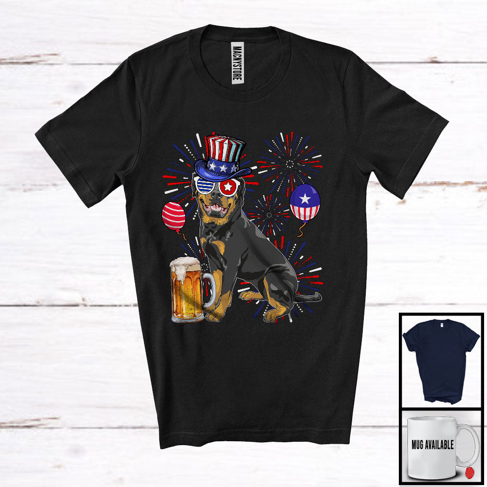 • Rottweiler Drinking Beer, Cheerful 4th Of July Drunker Fireworks, American Flag Patriotic Group T-Shirt. This cotton t-shirt is a durable staple product with a classic fit. One of the most popular items, it has a relaxed style made for everyday and casual wear.