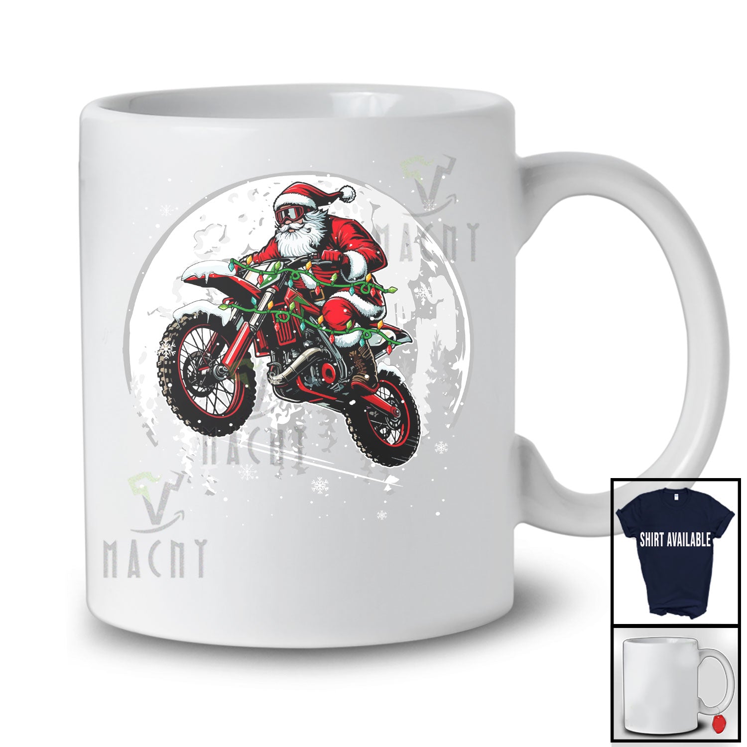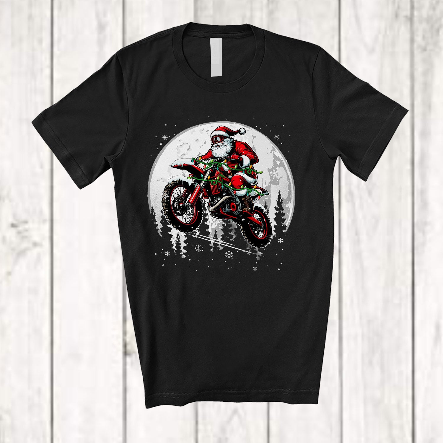 Santa Racing On Dirt Bike; Joyful Christmas Lights Biker Lover; X-mas Moon Matching Family T-Shirt