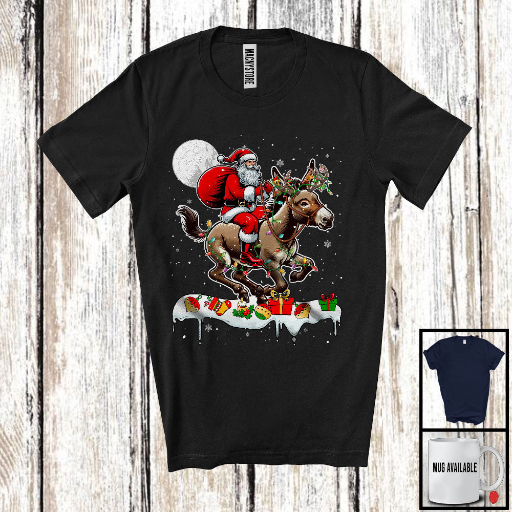 new MacnyStore - Santa Riding Donkey Reindeer; Amusing Christmas Lights Santa Donkey Animal; Snowing T-Shirt – Macnystore