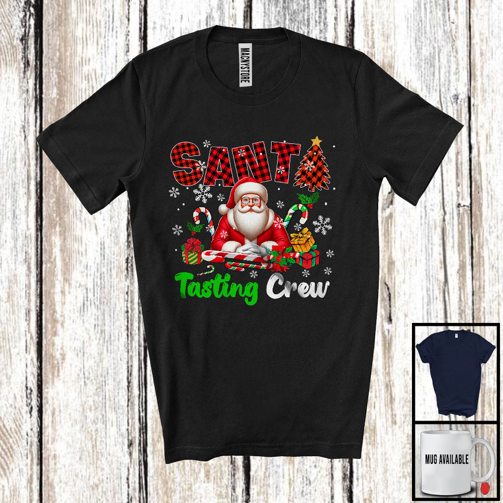 • Santa Tasting Crew, Lovely Christmas Plaid Santa Candy Canes, Snowing Around X-mas Family T-Shirt. This cotton t-shirt is a durable staple product with a classic fit. One of the most popular items, it has a relaxed style made for everyday and casual wear.