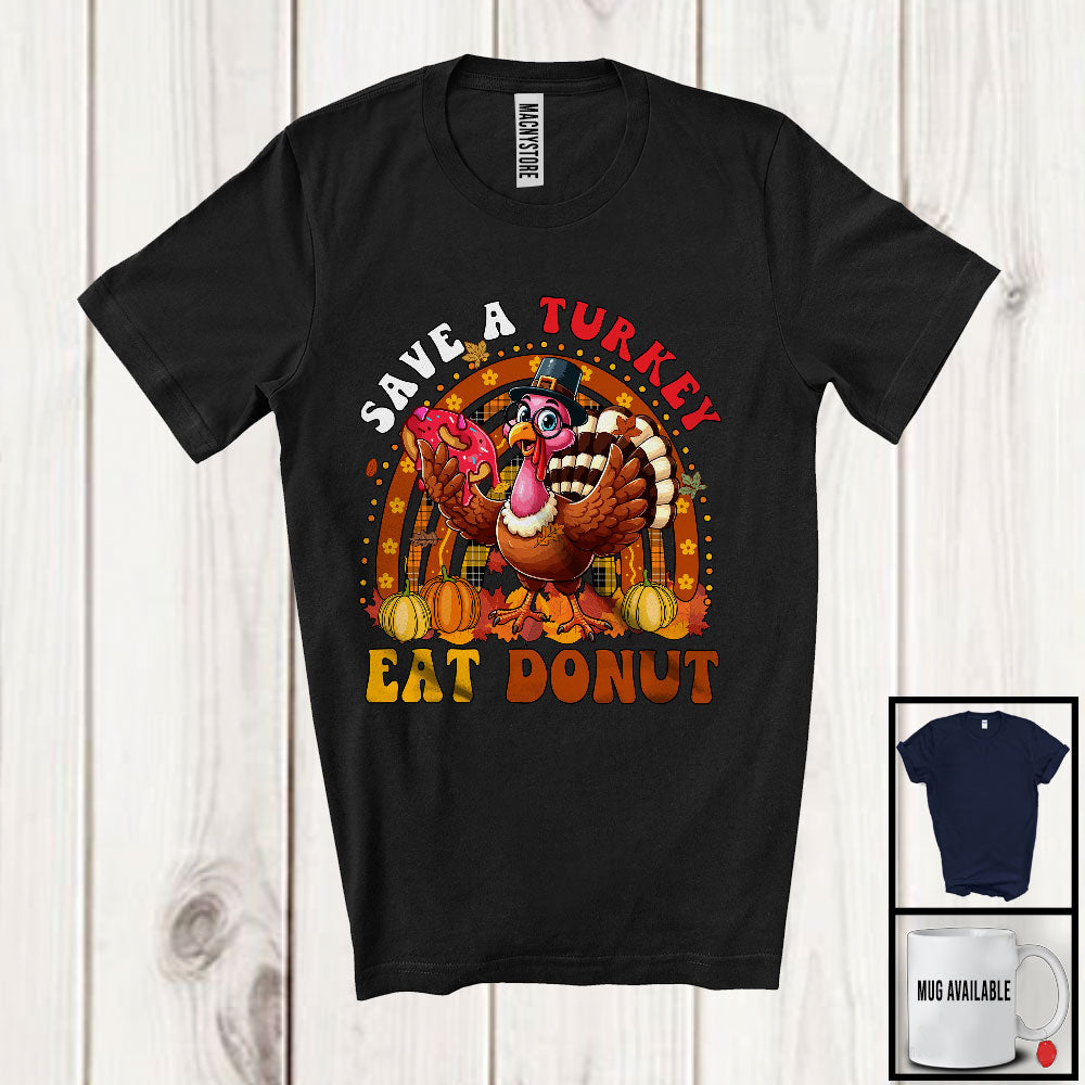 Save A Turkey Eat Donut; Awesome Thanksgiving Plaid Rainbow Turkey; Donut Food Lover T-Shirt. This cotton t-shirt is a durable staple product with a classic fit. One of the most popular items, it has a relaxed style made for everyday and casual wear.