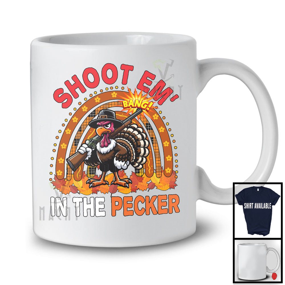 Shoot Em' The Pecker; Sarcastic Thanksgiving Turkey Hunting Hunter Lover; Plaid Rainbow T-Shirt. This cotton t-shirt is a durable staple product with a classic fit. One of the most popular items, it has a relaxed style made for everyday and casual wear.