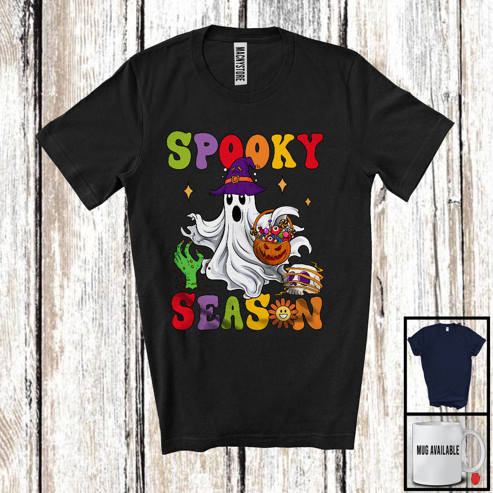 Spooky Season; Creepy Halloween Costume Boo Ghost Witch; Trick Or Treat Candy Family T-Shirt. This cotton t-shirt is a durable staple product with a classic fit. One of the most popular items, it has a relaxed style made for everyday and casual wear.