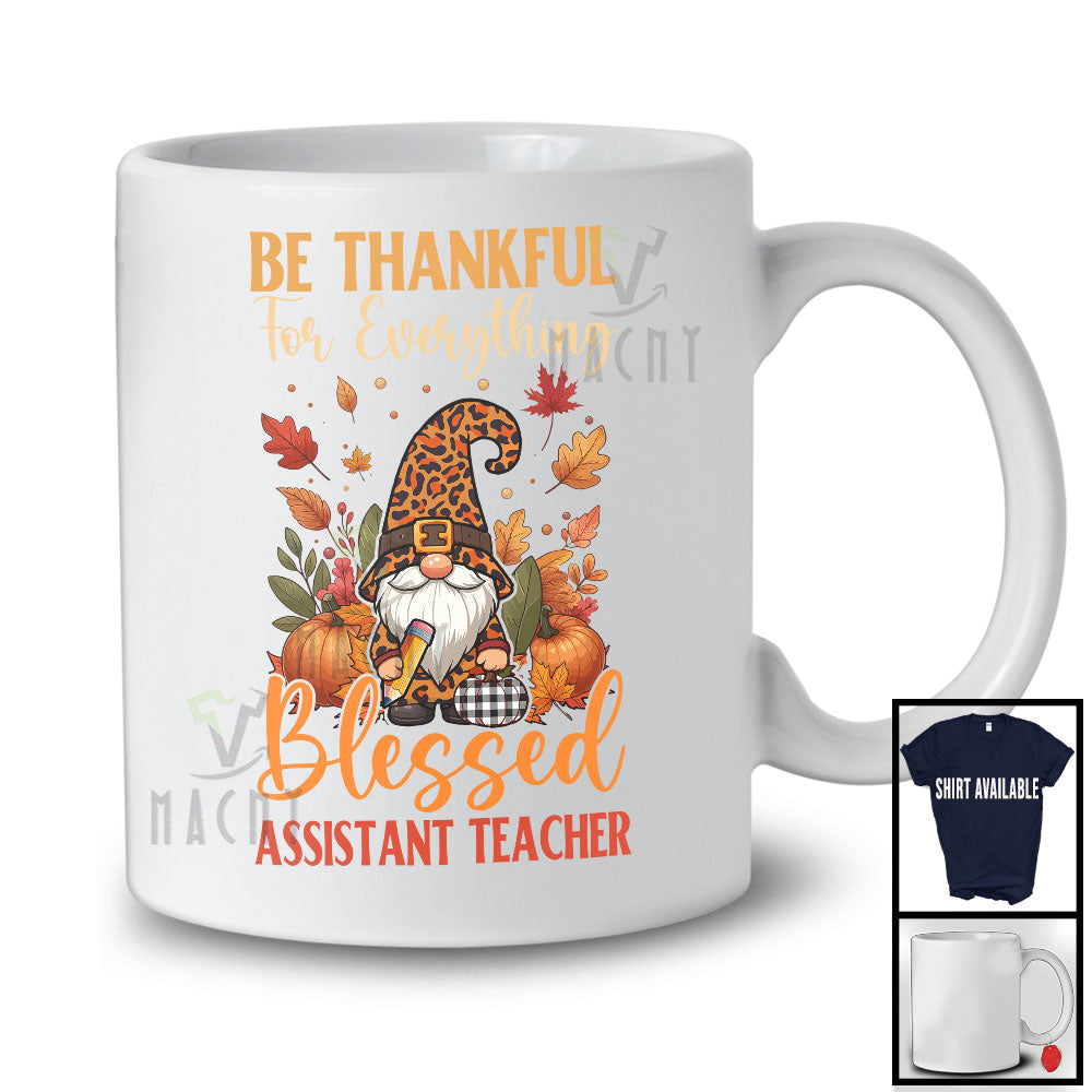 Thankful For Everything Blessed Assistant Teacher; Amazing Thanksgiving Leopard Gnome; Pumpkins T-Shirt. This cotton t-shirt is a durable staple product with a classic fit. One of the most popular items, it has a relaxed style made for everyday and casual wear.