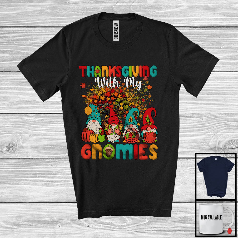 Thanksgiving With My Gnomies, Lovely Group Of Four Gnomes, Fall Leaves Tree Pumpkins T-Shirt