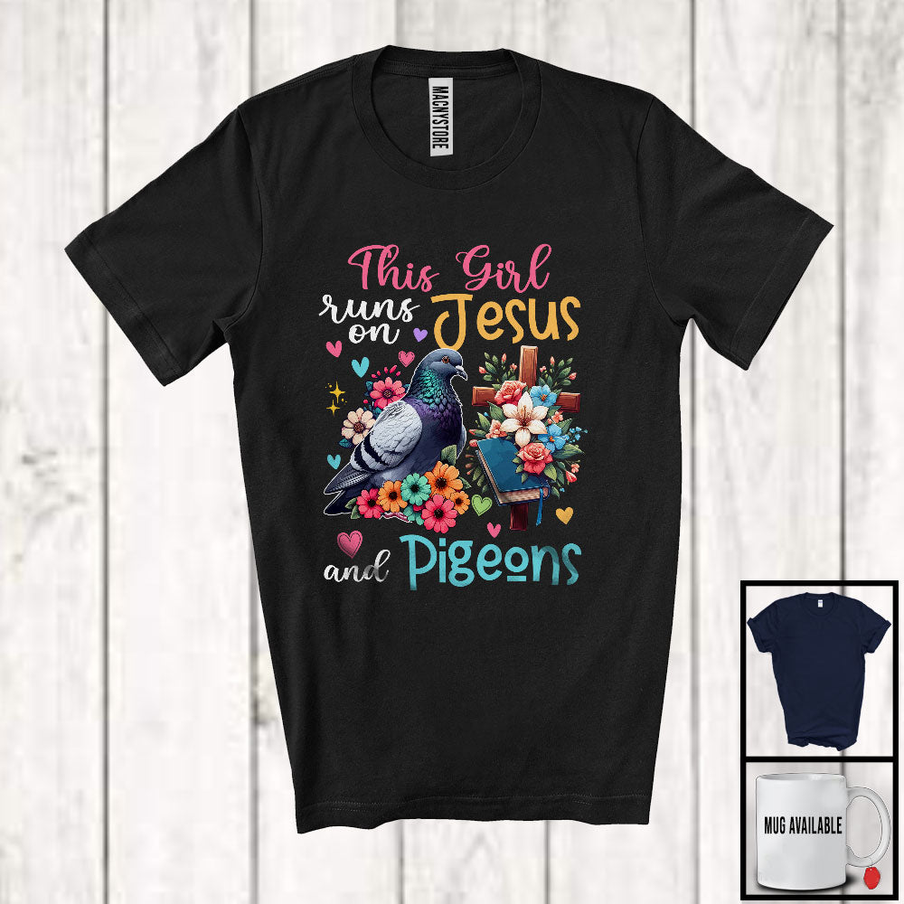 This Girl Runs On Jesus And Pigeons, Adorable Flowers Matching Bird Lover, Family Group T-Shirt. This cotton t-shirt is a durable staple product with a classic fit. One of the most popular items, it has a relaxed style made for everyday and casual wear.