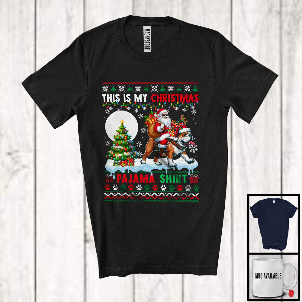 This Is My Christmas Pajama Shirt; Joyful Santa Riding Reindeer Bulldog Puppy; X-mas Sweater T-Shirt. This cotton t-shirt is a durable staple product with a classic fit. One of the most popular items, it has a relaxed style made for everyday and casual wear.