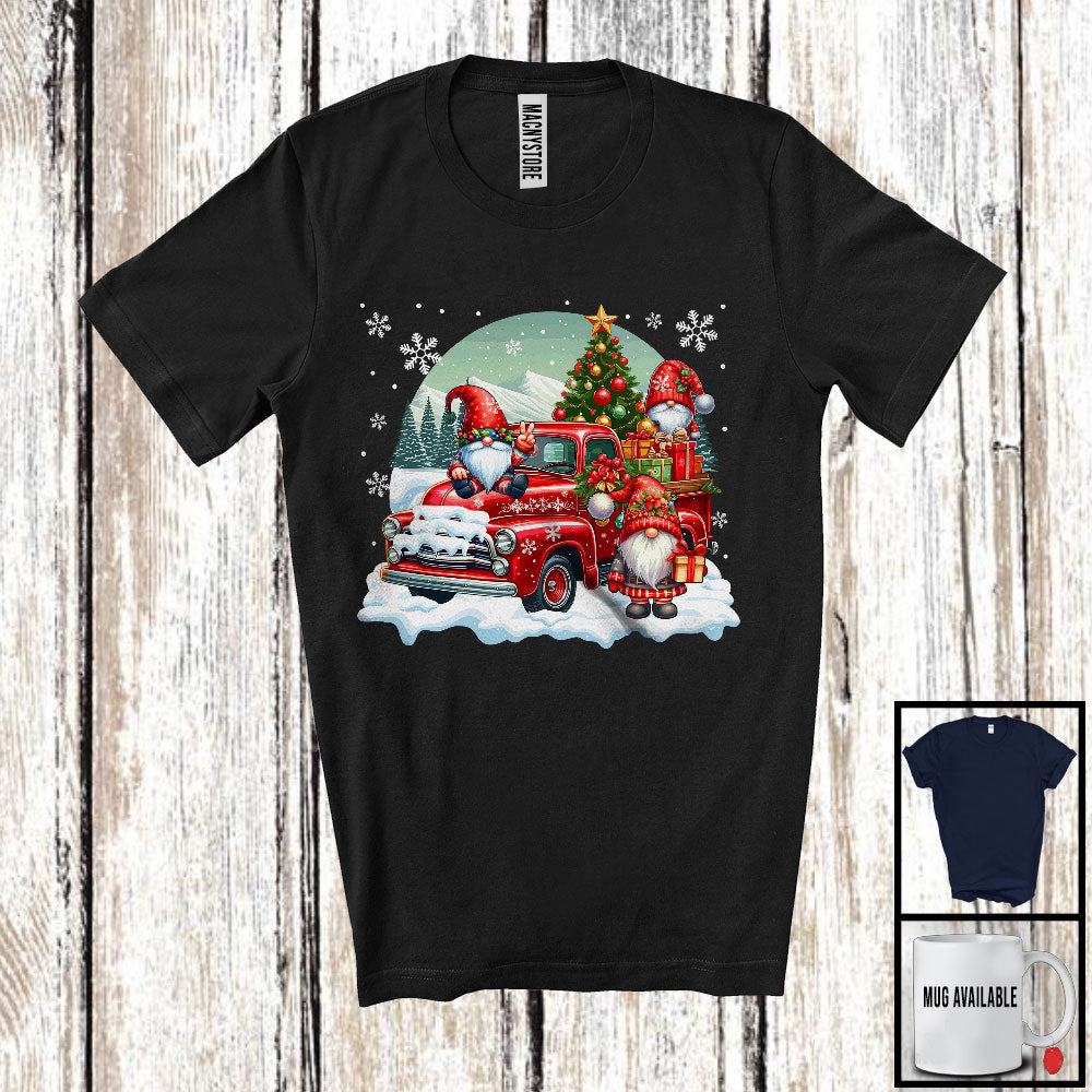Three Gnomes On Pickup Truck, Lovely Christmas Tree Gnomies On Pickup Truck, Snowing T-Shirt