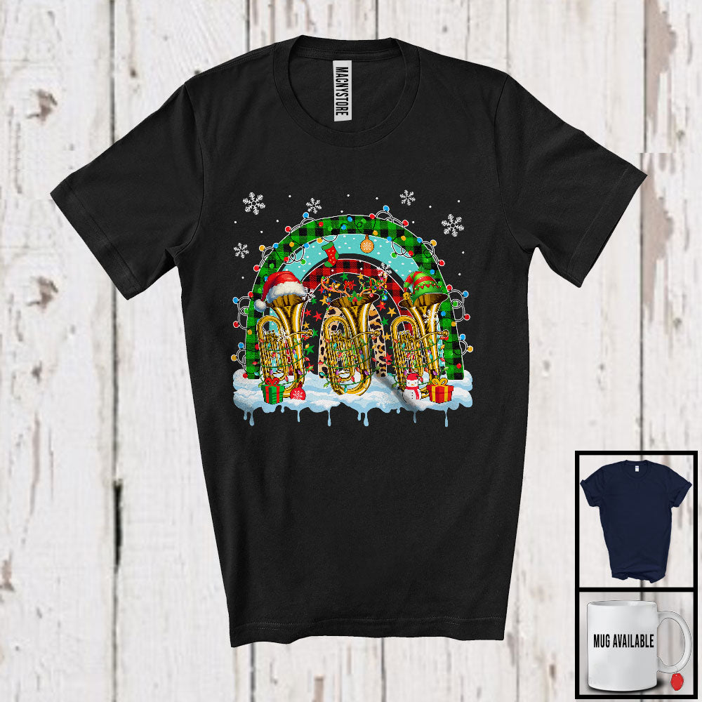 Three Santa Reindeer Elf Tuba; Wonderful Christmas Lights Leopard Plaid Rainbow; Tuba Player T-Shirt. This cotton t-shirt is a durable staple product with a classic fit. One of the most popular items, it has a relaxed style made for everyday and casual wear.