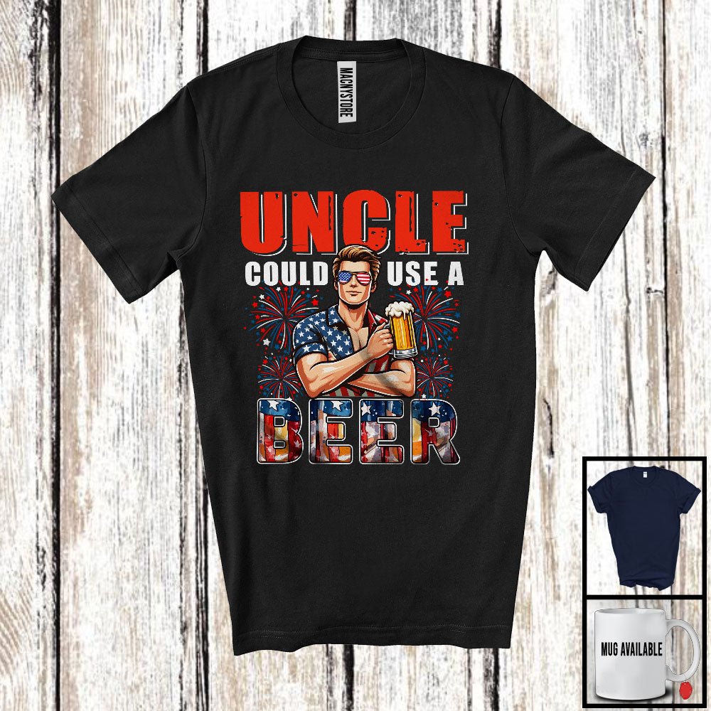 • Uncle Could Use A Beer, Awesome 4th Of July Drinking Beer Fireworks, Patriotic Family Group T-Shirt. This cotton t-shirt is a durable staple product with a classic fit. One of the most popular items, it has a relaxed style made for everyday and casual wear.