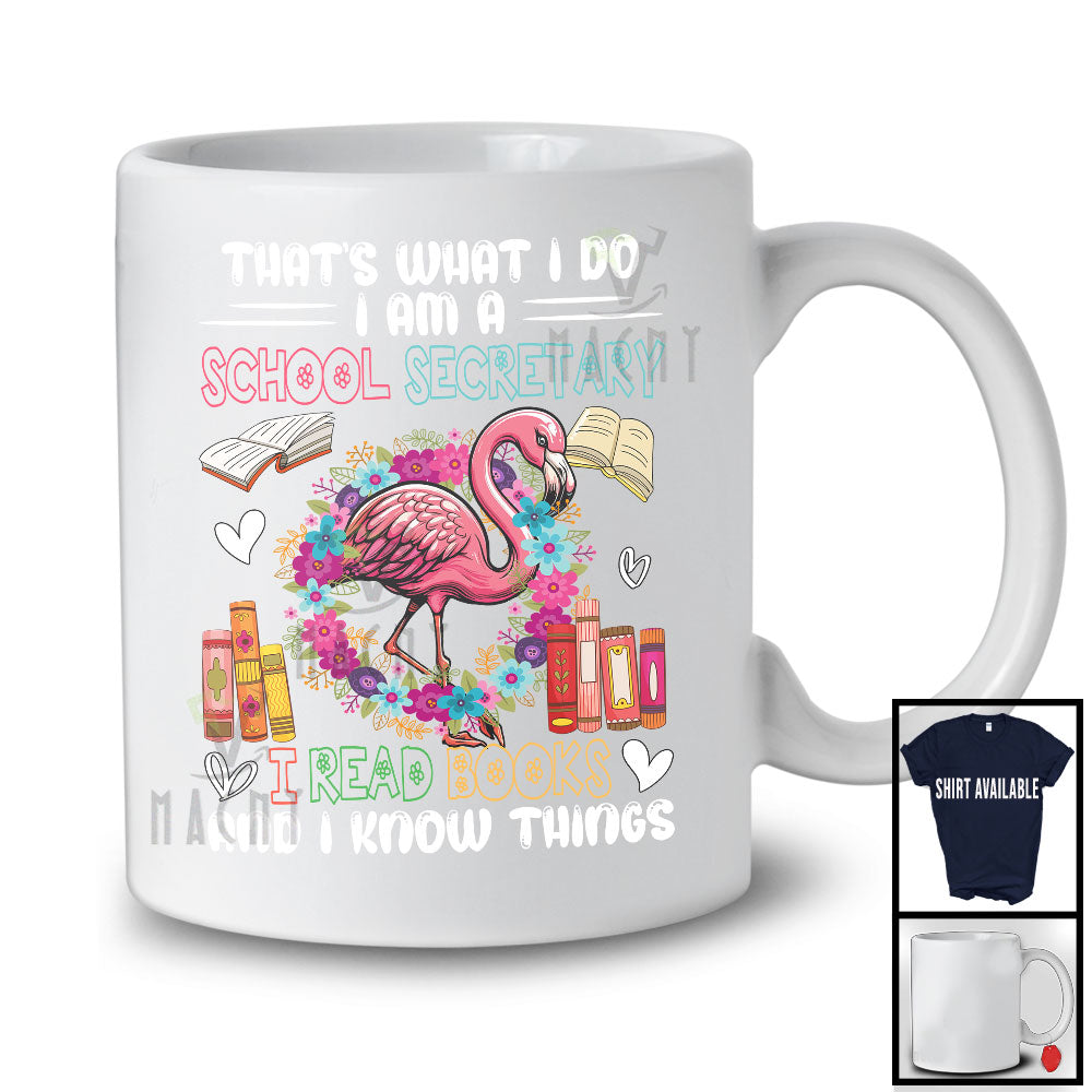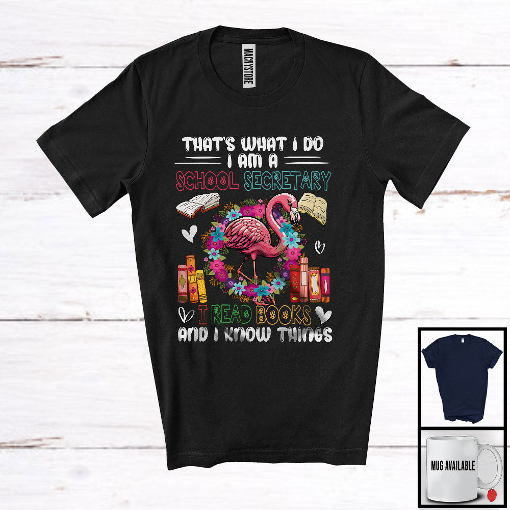• What I Do I Am A School Secretary I Read Books, Adorable Flamingo In Flowers Circle, Reading T-Shirt. This cotton t-shirt is a durable staple product with a classic fit. One of the most popular items, it has a relaxed style made for everyday and casual wear.
