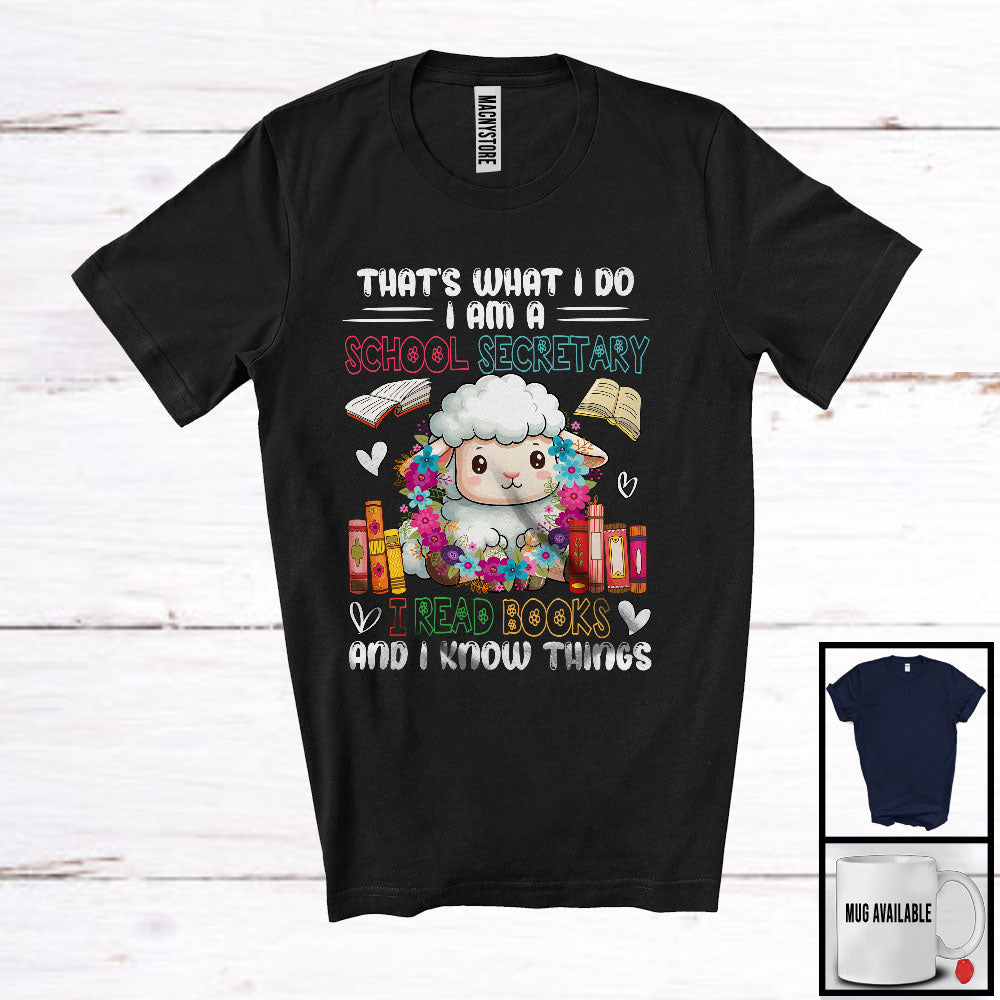 What I Do I Am A School Secretary I Read Books, Adorable Sheep In Flowers Circle, Reading T-Shirt. This cotton t-shirt is a durable staple product with a classic fit. One of the most popular items, it has a relaxed style made for everyday and casual wear.