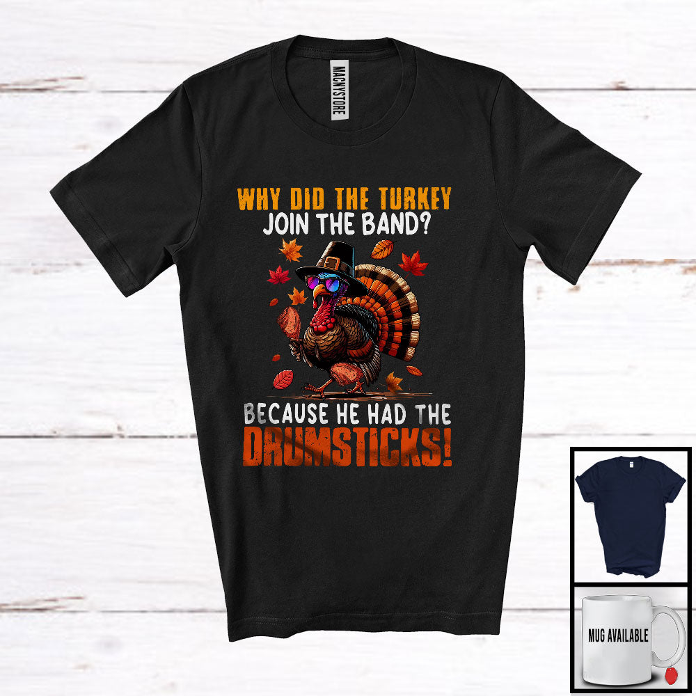 • Why Did The Turkey Join The Band Drumsticks, Amazing Thanksgiving Turkey, Fall Leaves T-Shirt. This cotton t-shirt is a durable staple product with a classic fit. One of the most popular items, it has a relaxed style made for everyday and casual wear.
