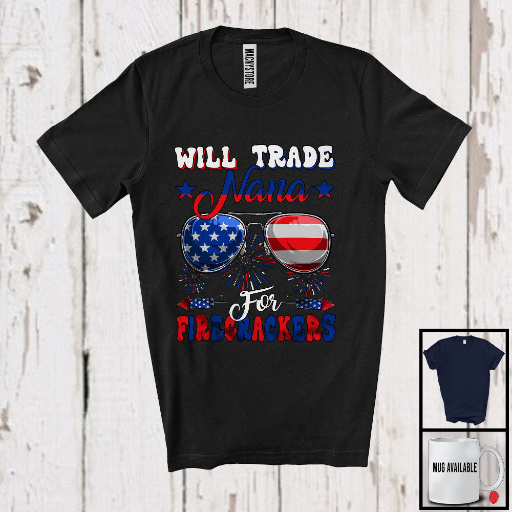 Will Trade Nana For Firecrackers, Cheerful 4th Of July American Flag Sunglasses, Patriotic Family T-Shirt. This cotton t-shirt is a durable staple product with a classic fit. One of the most popular items, it has a relaxed style made for everyday and casual wear.