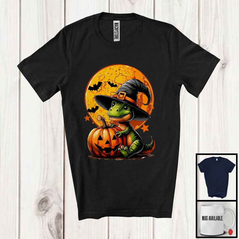 Witch Dinosaur Holding Carved Pumpkin; Horror Halloween Moon T-Rex Lover; Family Group T-Shirt