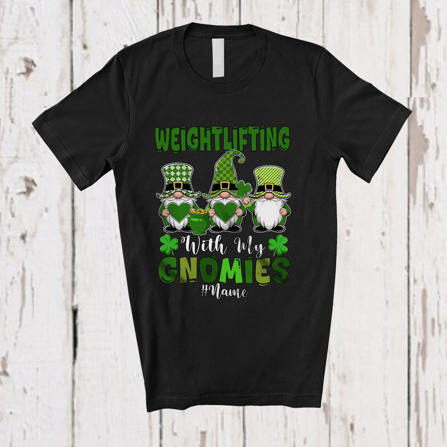 • Personalized Weightlifting With My Gnomies; Lovely St. Patrick's Day Custom Name Three Green Gnomes T-Shirt. This cotton t-shirt is a durable staple product with a classic fit. One of the most popular items, it has a relaxed style made for everyday and casual wear.