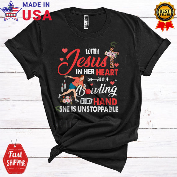 With Jesus In Her Heart And A Bowling In Her Hand Cool Floral Flowers Bowling Player Playing Lover T-Shirt