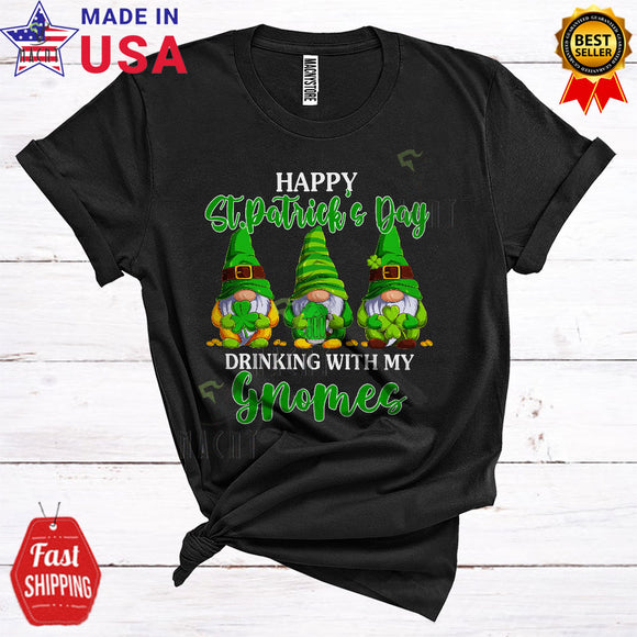 Happy St. Patrick's Day Drinking With My Gnomies Funny Cute Three Gnomes Drunk Drinking Lover T-Shirt