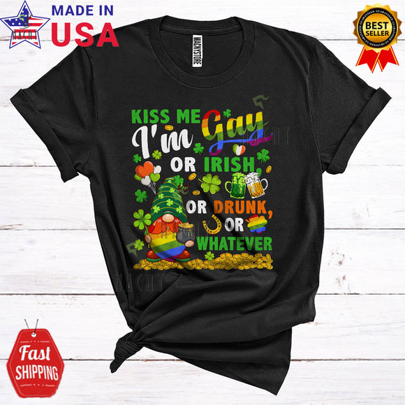Kiss Me I'm Gay Drunk Funny Cute St. Patrick's Day Irish Gnome LGBTQ Pride Shamrock Lover T-Shirt