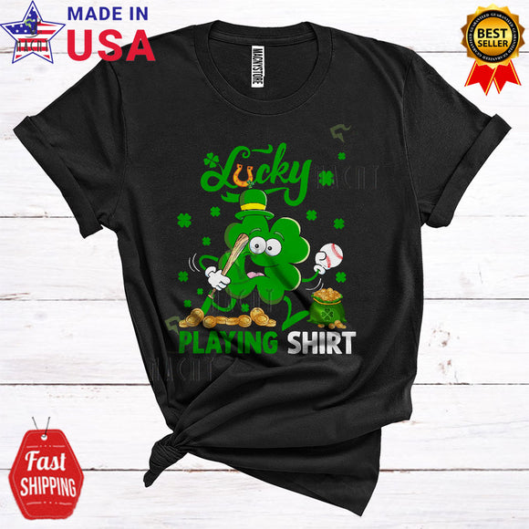 Lucky Playing Shirt Funny Cute St. Patrick's Day Leprechaun Shamrock Playing Baseball Player Team T-Shirt