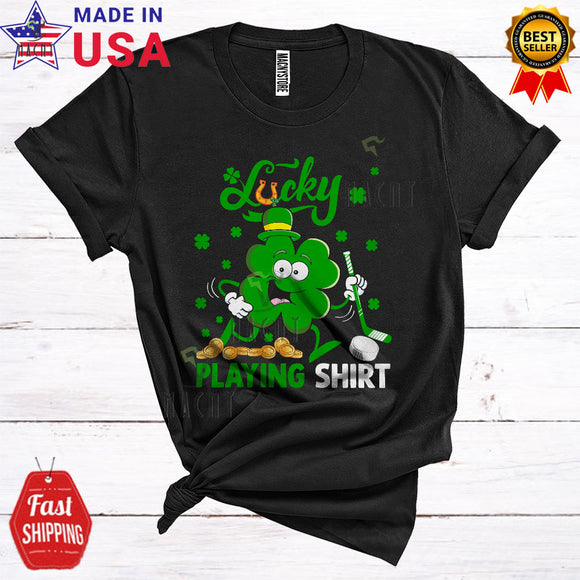 Lucky Playing Shirt Funny Cute St. Patrick's Day Leprechaun Shamrock Playing Ice Hockey Player Team T-Shirt