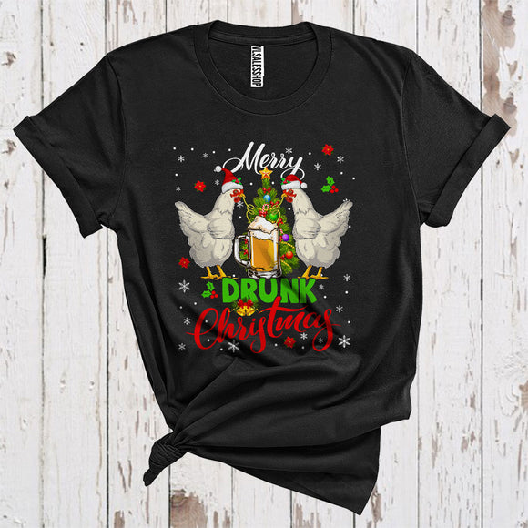 Merry Drunk Christmas Funny Two Santa Chicken Drinking Beer Farm Animal Lover T-Shirt