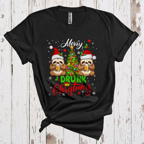Merry Drunk Christmas Funny Two Santa Sloth Drinking Beer Zoo Animal Lover T-Shirt