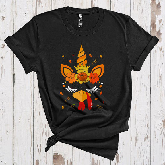 Turkey Unicorn Face With Floral Pumpkin Crown Cute Thanksgiving Autumn Fall Leaves T-Shirt
