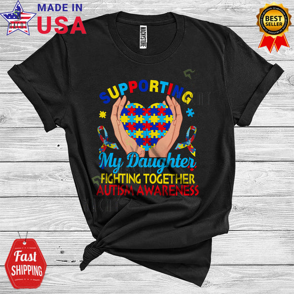 Supporting My Daughter Fighting Together Cute Cool Autism Awareness Puzzle Ribbon Heart Family T-Shirt