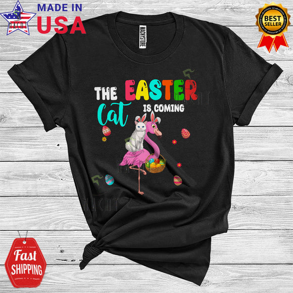 The Easter Bunny Is Coming Cool Cute Easter Day Bunny Cat Riding Flamingo Hunting Easter Eggs Flowers T-Shirt