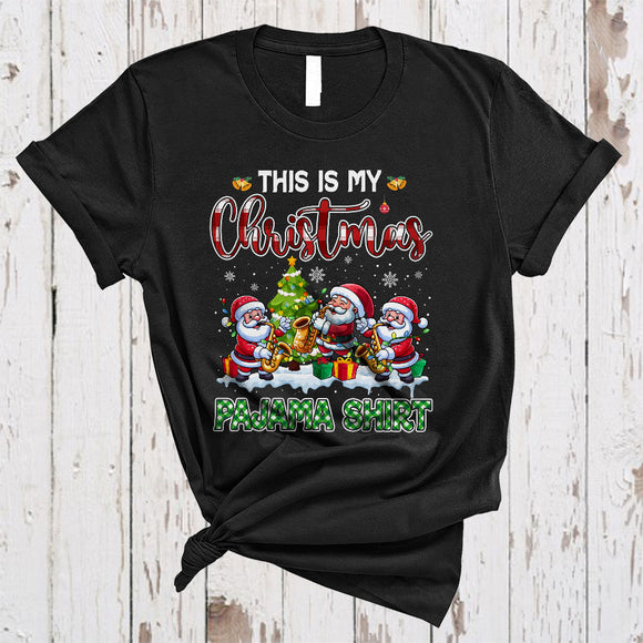 This Is My Christmas Pajama Shirt, Cute Plaid Three Santa Playing Saxophone, Saxophone Player Group T-Shirt