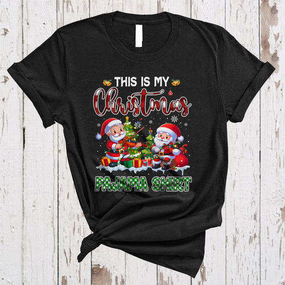 This Is My Christmas Pajama Shirt, Cute Plaid Three Santa Playing Violon, Violon Player Group T-Shirt