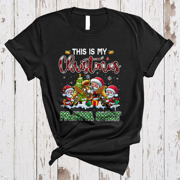 This Is My Christmas Pajama Shirt, Cute Plaid Three Santa Playing Tuba, Tuba Player Group T-Shirt