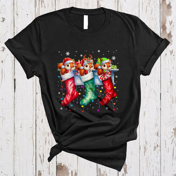 Three Santa Reindeer ELF Squirrel In Christmas Socks, Colorful X-mas Animal, Family Group T-Shirt