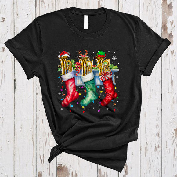Three Santa Reindeer ELF Tuba In Christmas Socks, Colorful X-mas Music, Family Group T-Shirt