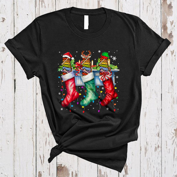 Three Santa Reindeer ELF Xylophone In Christmas Socks, Colorful X-mas Music, Family Group T-Shirt
