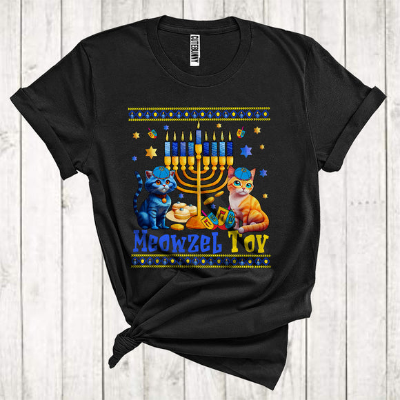 Meowzel Tov Cool Hanukkah Chanukah Sweater Proud Jewish Menorah Yellow Blue Cats T-Shirt