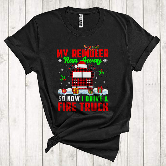 My Reindeer Ran Away So Now I Drive A Fire Truck Cute Christmas Snow Red Plaid Santa Truck T-Shirt