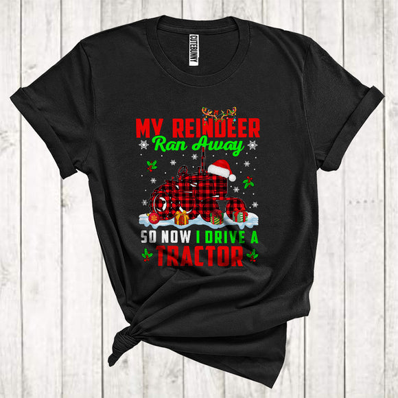 My Reindeer Ran Away So Now I Drive A Tractor Cute Christmas Snow Red Plaid Santa Truck T-Shirt