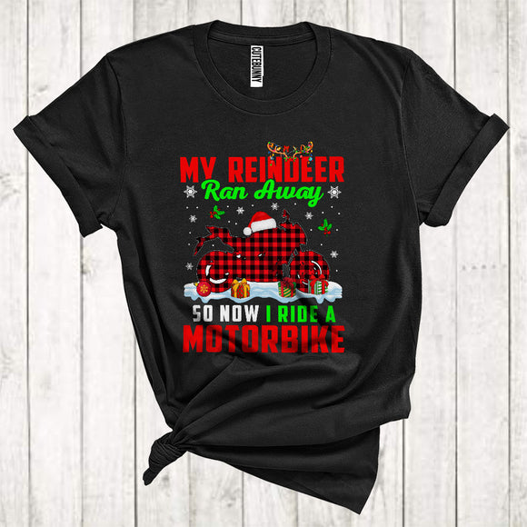My Reindeer Ran Away So Now I Ride A Motorbike Cute Christmas Snow Red Plaid Santa Lover T-Shirt