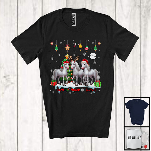 Personalized Custom Name Three Elf Santa Horse Snowing; Joyful Christmas Tree Animal T-Shirt
